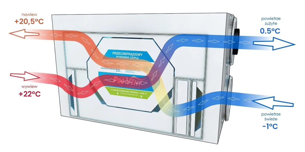 Strumienie powietrza nie mieszają się ze sobą, ale przekazują energię cieplną. Zimą ciepło z powietrza wywiewanego ogrzewa powietrze nawiewane, a latem proces działa odwrotnie – powietrze nawiewane jest wstępnie schładzane.